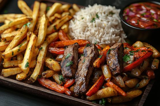 El lomo saltado es un claro ejemplo de la fusión de la cocina criolla peruana con la influencia china. Este plato combina tiras de carne de res salteadas con cebolla, tomate y ají amarillo en salsa de soja, todo servido sobre arroz blanco y acompañado de papas fritas. La mezcla de sabores y texturas lo convierte en uno de los favoritos tanto de locales como de turistas.